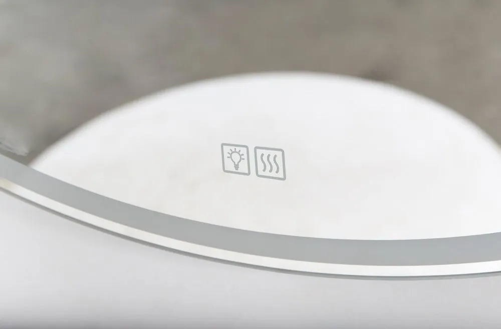 Декоративная светодиодная подсветка по всему периметру зеркала. Возможность регулировки яркости (диммер) подсветки. Подогрев полотна зеркала. Обратная сторона зеркала защищена пластиковой панелью от попадания воды и влаги. На зеркале установлен двойной сенсор, блок увеличенной мощности, с помощью которого производиться отдельное включение подсветки и подогрева зеркала. Однократное нажатие сенсора включает или выключает функцию, соответственно символу на зеркале, длительное удержание выключает подсветку клавиш сенсора.
