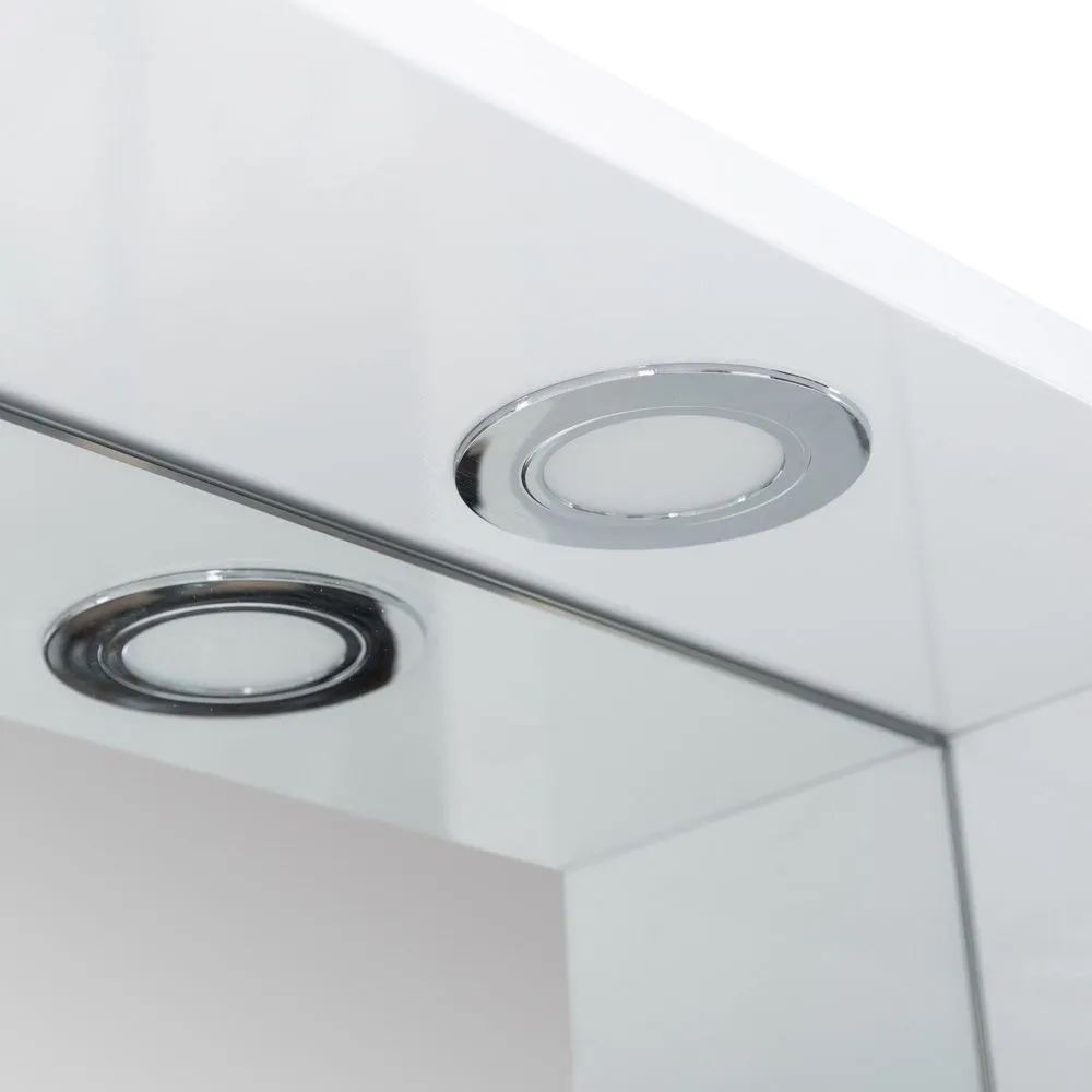 Зеркало-шкаф имеет одну распашную дверь, две внутренние стеклянные полки, врезные (фрезерованные) ручки в плоскости фасада, светильники LED 2x4W.